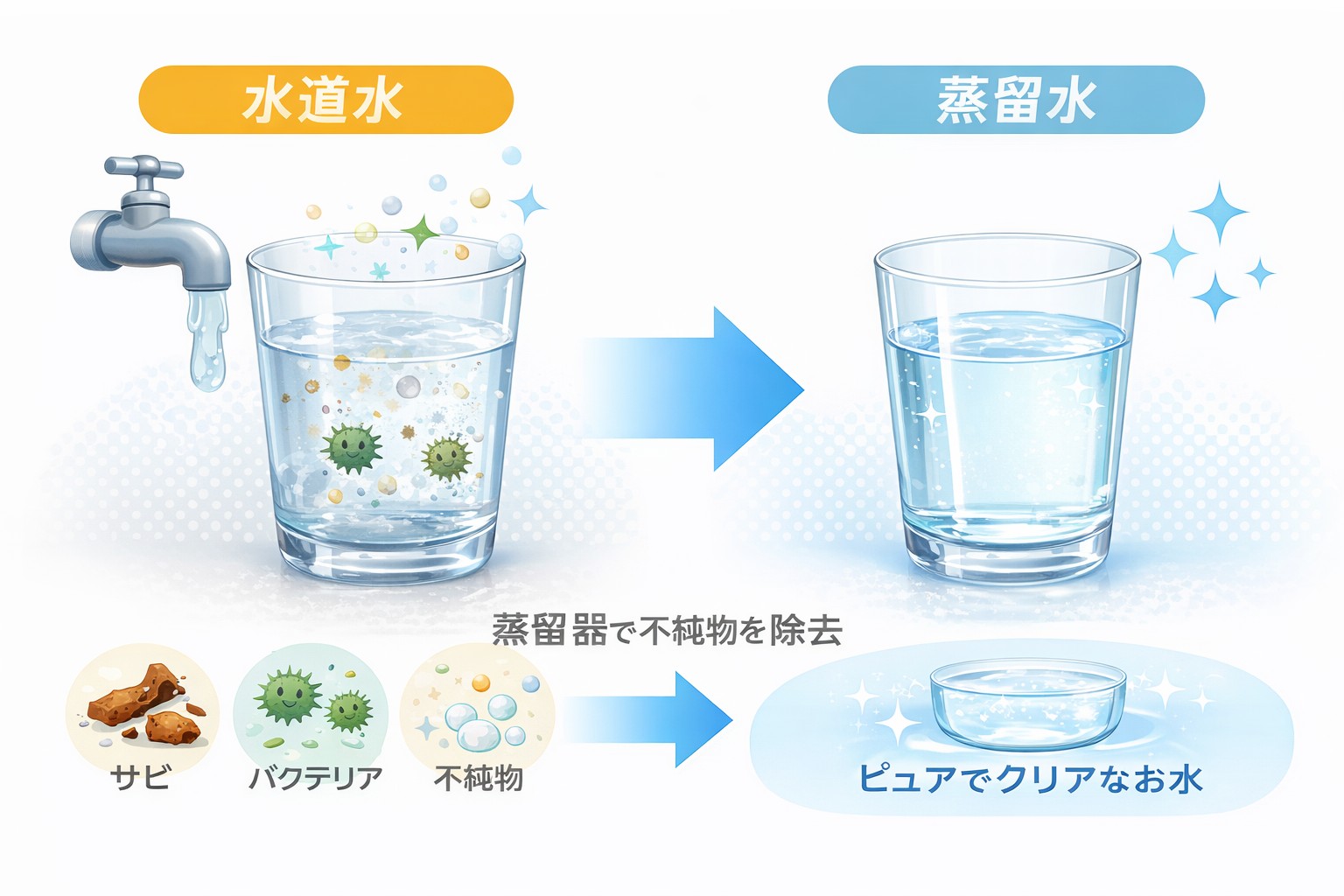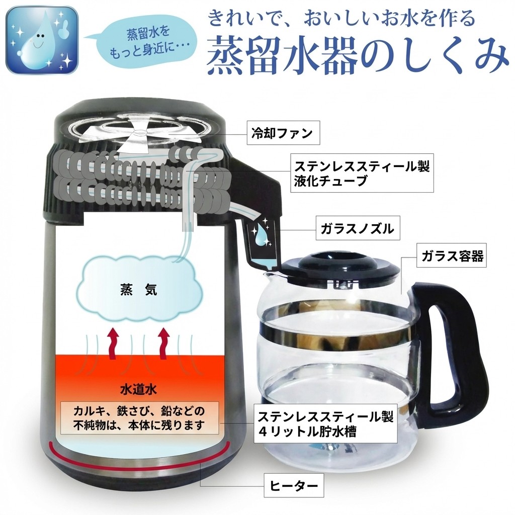 水を一度沸騰させて水蒸気にし、それを冷却して再び水に戻す「蒸留」という仕組みにより、